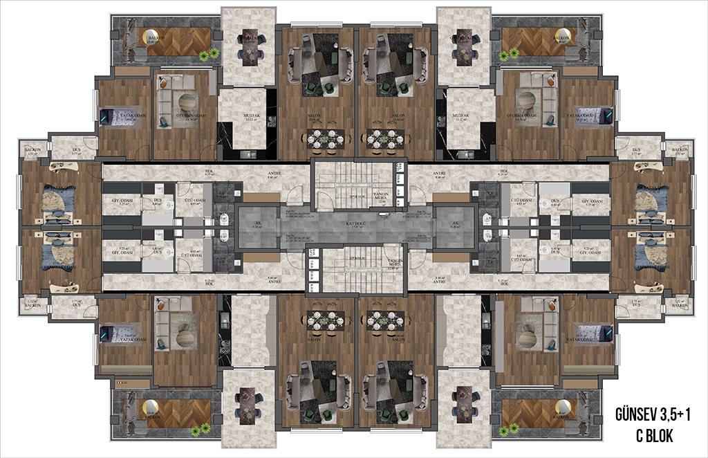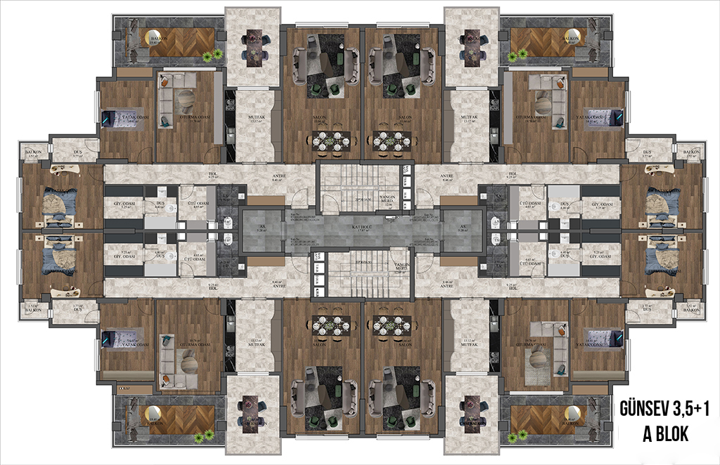 GAZİANTEPİN GÖZDESİ GÜNSEV SİTESİ-7 Modern, şık, yüksek sosyal donatıları ve konumu ile Günsev Sitesi-7 büyük ilgi görüyor. Gaziantep’in eski köy hizmetleri bölgesinde yükselen Günsev Sitesi-7 projesi 165 konuttan oluşuyor. 2+1 (138 m2) ve 3,5+1 (206 m2) daire seçenekleri ile İbrahimli bölgesinde oturmak isteyenlere harika bir seçenek sunuyor. Bölgede az olan 2+1 seçeneği ile farklılık oluşturan projede, Türk Hamamı, Sauna, Buhar odası, kapalı açık spor alanları, çocuk oyun alanları, kapalı otopark yer alıyor. Proje üç bloktan meydana geliyor. Günsev Sitesi-7 geniş aileler içinde güzel fırsatlar sunuyor. Büyüklerine yakın olmak isteyenler çekirdek ailelerine 3,5+1 alırken anne babalarına 2+1 daire alıyor. Aynı binada ailelere yaşama şansı sunuyor. Proje konumu itibari ile Devlet okulları, Özel okullar, Hastaneler, AVM’ler, Gaziantep Adliyesi, Recep Tayyip Erdoğan Sağlıklı yaşam parkı gibi cazibe merkezlerine yakınlığı ile dikkat çekiyor. Günsev Sitesi-7 ulaşım ağlarının merkezinde bulunuyor. İpek yoluna, Tramvaya, otobüs ve Dolmuş duraklarına yürüyüş mesafesinde. Otogara araçla beş dakikada ulaşma şansına sahipsiniz. Havaalanına ipek yolunda trafiğe takılmadan 30 dk’da ulaşabilirsiniz. Yeni gara hiçbir ışığa takılmadan 4 dakikada ulaşma imkânınız var. Şehrin manzarası, Dülük ormanlardan gelen temiz hava projeye değer katan özelliklerden. İbrahimli bölgesinde Güvenevler’de Günsev kalitesi ile inşa edilen projeye yoğun ilgi var. "Daha güzel günler için" GÜNSEV İNŞAAT